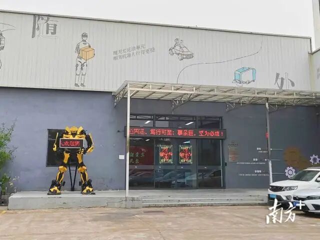 在天太机器人工厂门口,摆放着一个起码3米高的变形金刚机器人。企业供图